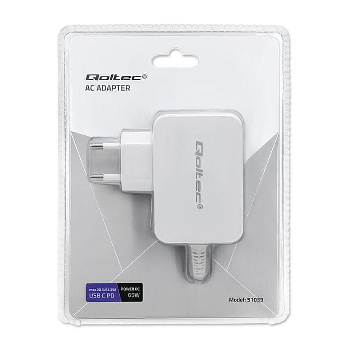 Qoltec AC adapter 65W | 5–20,3 V | 2–3,25 A | USB tip C | PD | Prenosnik | Pametni telefon | Bela Celoten opis
