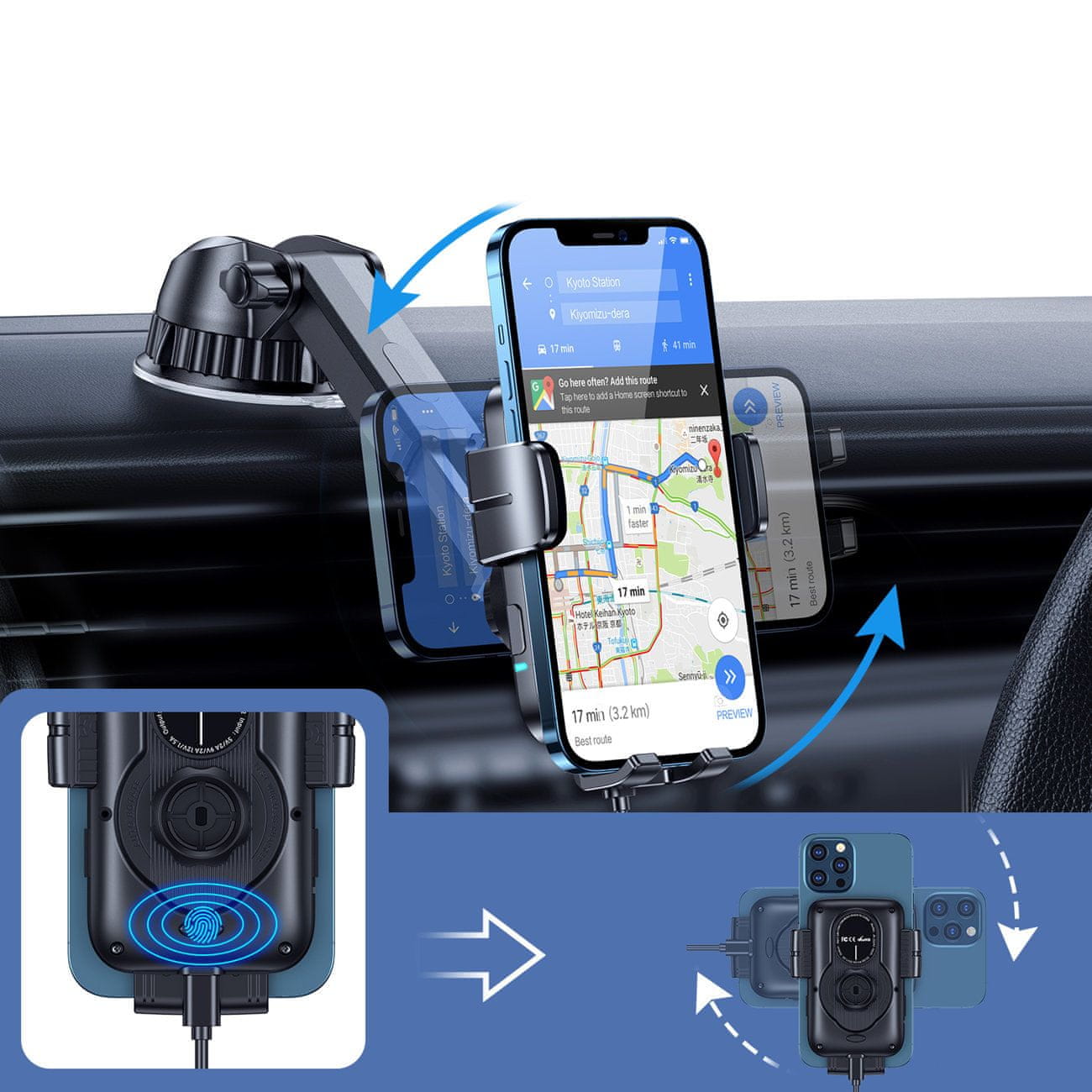 Avtomobilsko držalo z vgrajenim brezžičnim polnilnikom Qi. Pripomoček je bil ustvarjen za namestitev na armaturno ploščo avtomobila in zasnovan tako, da zagotavlja popolno varnost opreme, ki je nameščena nanj. Pripomoček je izjemno enostaven za uporabo. Preprosto položite telefon nanj in stisnite čeljusti skupaj. Poleg tega posebna trikotna konstrukcija zagotavlja stabilnost med vožnjo, velike možnosti nastavitve omogočajo, da napravo prilagodite svojim potrebam, zaradi gumijastih elementov pa nosilec ne bo opraskal kokpita.
