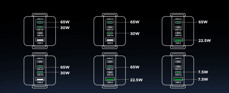 3 priključki USB-C in 1 priključki USB-A zagotavljajo do 100 W za telefone, tablice, prenosnike in drugo, vse hkrati s hitrim polnjenjem.