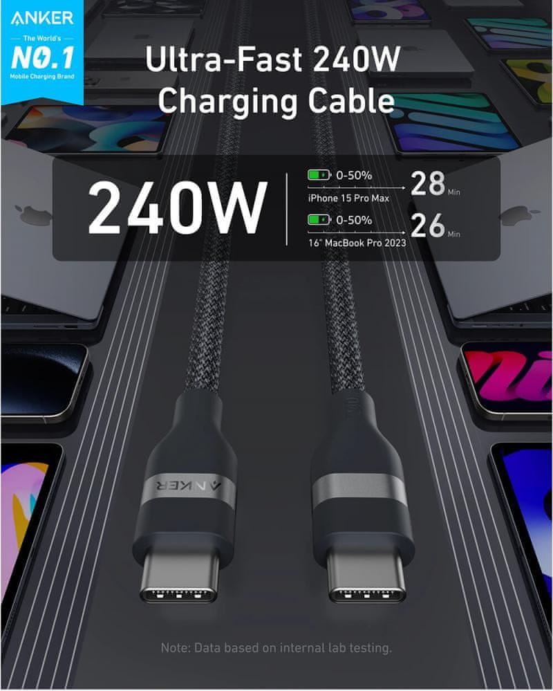 Izjemno hiter 240W kabelTa USB-IF certificiran kabel z močjo 240 W lahko napolni vaš 16-palčni MacBook Pro (2023) do 50 % v samo 28 minutah ali vaš iPhone 15 Pro do 50 % v 26 minutah. Celoten opis