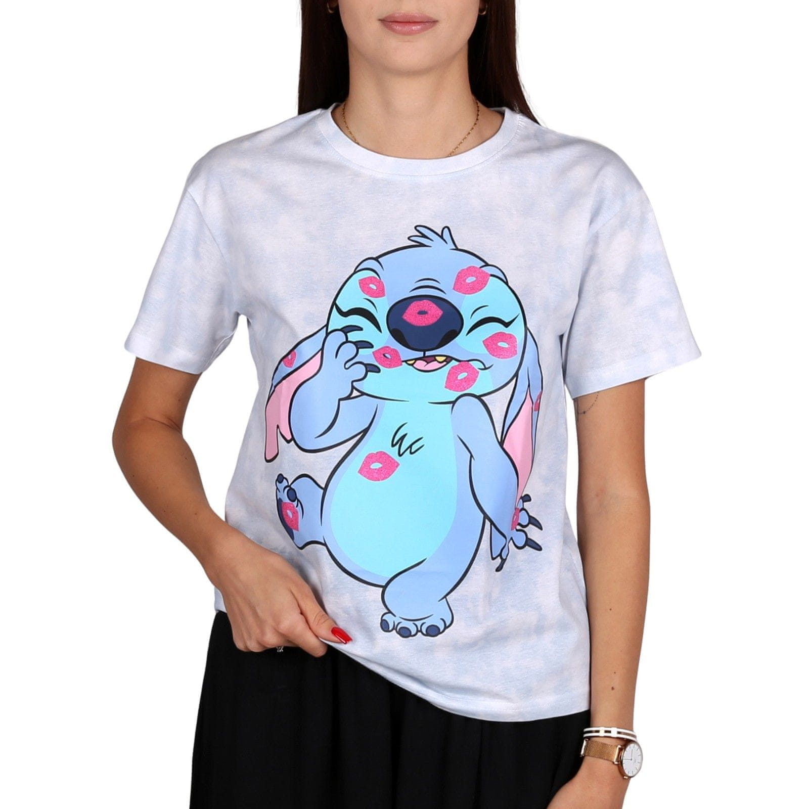 Ta ženska majica z zabavnim motivom Stitch, pokrita s potiski poljubčkov, je odlična izbira za ljubitelje pravljičnih likov.
