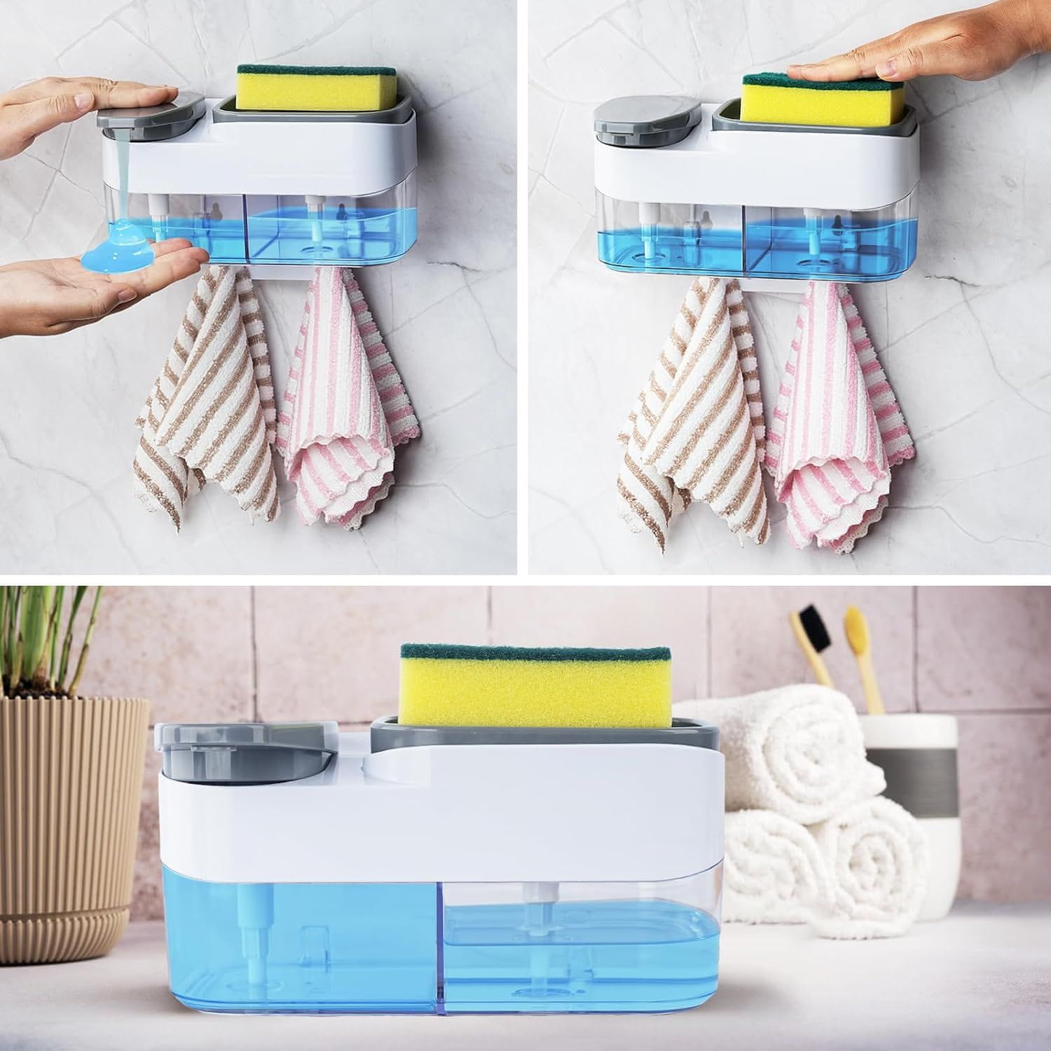 Nikcorp Stenski dozirnik za milo in detergent 2v1 z držalom za gobico, 2x500 ml, za kuhinjo in kopalnico, prozoren