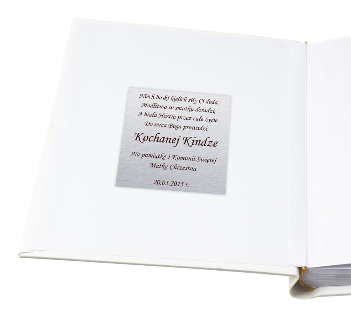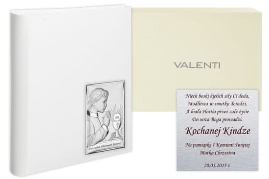 Čudovit album italijanskega podjetja. Ustvarjen je z uporabo najkakovostnejših komponent. Trda vezava je prekrita z izjemno elegantnim,belo usnjeekološko usnje. Ovitek je obogaten s čudovito srebrno podobo prvoobhajilnega spominka za fantka. Slika je izdelana iz srebra najvišje kakovosti999,95, ki je zaradi posebne tehnologije (atomski procesi) veliko trša in bolj odporna na madeže in praske kot tradicionalne metode posrebrenja. V albumu boste našli 30 šivanih, brez kislin, fotovarnih listov belega papirja s pregradami iz pergamentnega papirja, v katere zlahka spravite 120 fotografij v velikostih: 9 × 13 cm in 10 × 15 cm ali 60 fotografij v formatih 13 × 18 cm ali večjih.