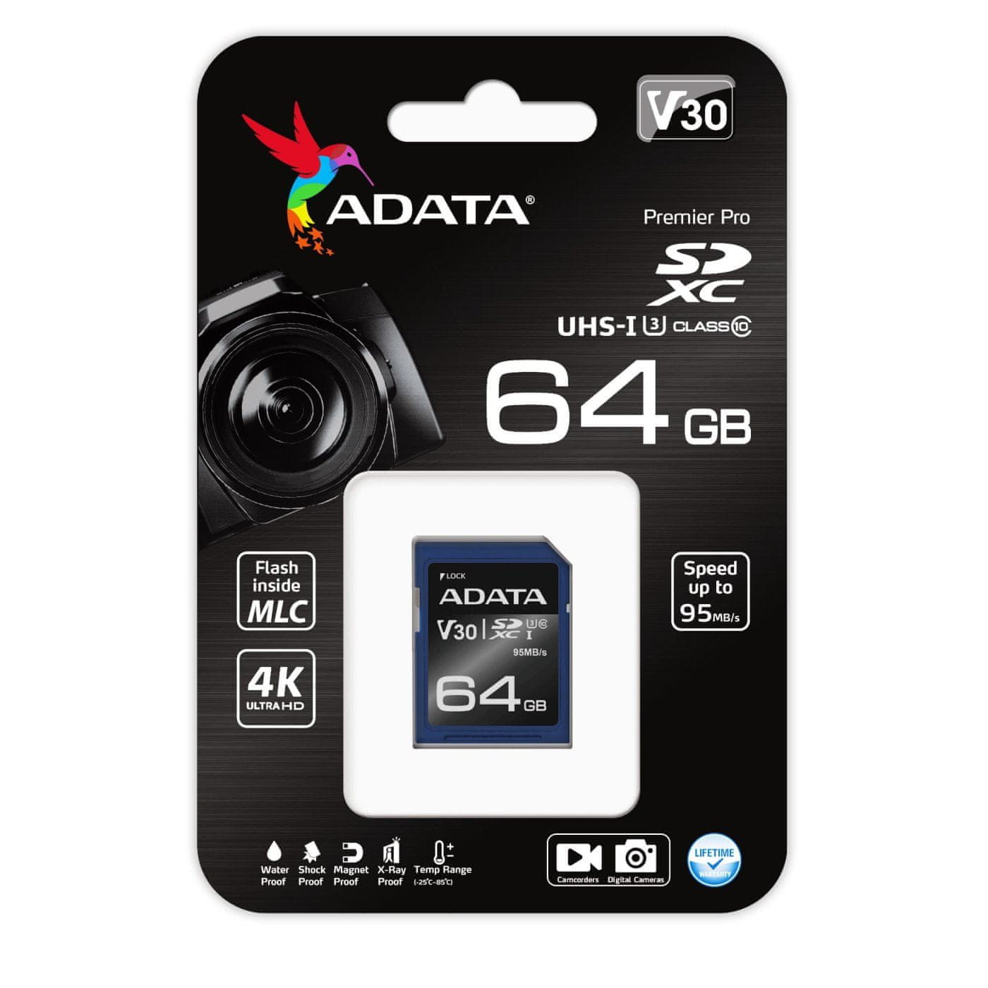 Pomnilniško kartico ADATA Premier Pro SDXC odlikujejo visoke hitrosti branja in pisanja podatkov, ki so primerne za snemanje medijev v ločljivosti Full HD in celo do kakovosti 4K. Primerna je za uporabo v profesionalnih digitalnih fotoaparatih in videokamerah.