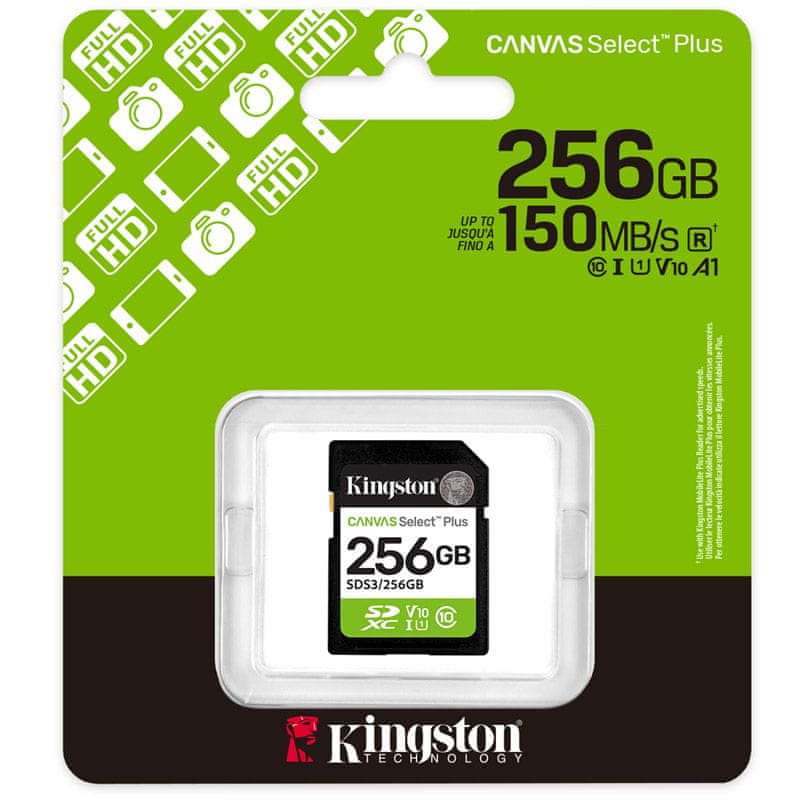 KINGSTON Canvas Select Plus SD 256GB Class10 UHS-I (SDS3/256GB) spominska kartica Kingstonova SD-kartica Canvas Select Plus nudi zanesljivo zmogljivost s hitrostjo do 150 MB/s, kar je idealn Celoten opis