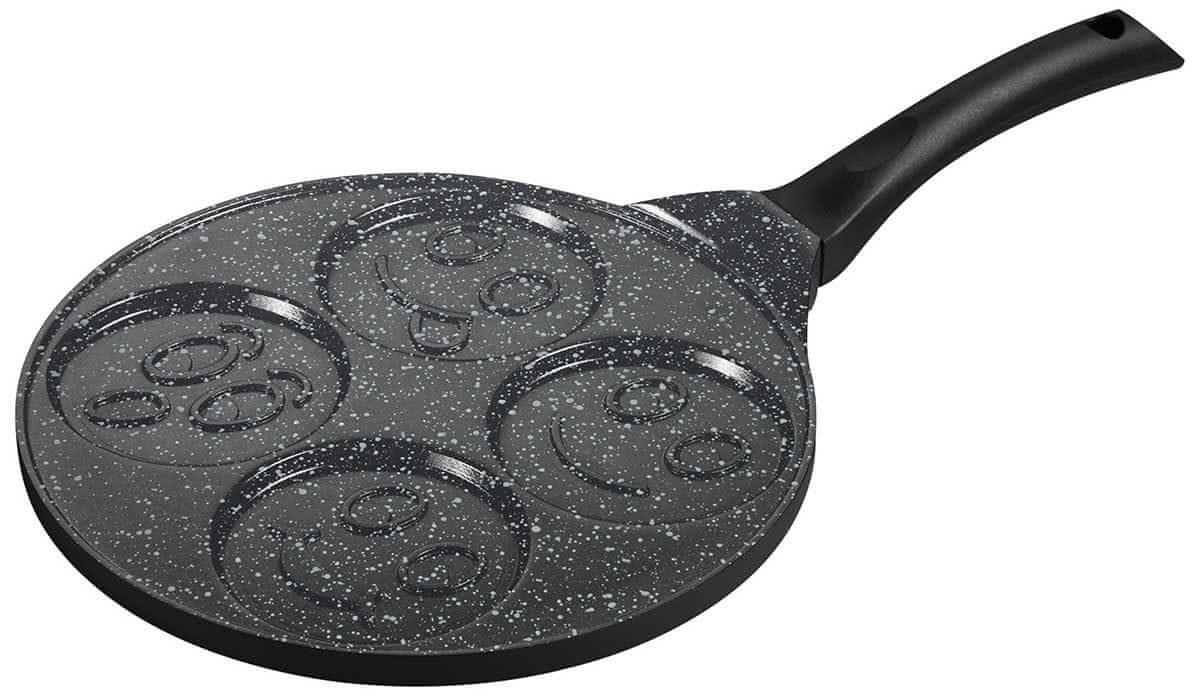 Težka ponev za palačinke „4 SMILEYS“ Ø27cm. Narejen iz masivnega litega aluminija. Pokrit z granitno prevleko nove generacije. Za razliko od klasičnih lahkih ponev se ta bolj segreje in dlje ohranja temperaturo. Ima silikonski ročaj.
