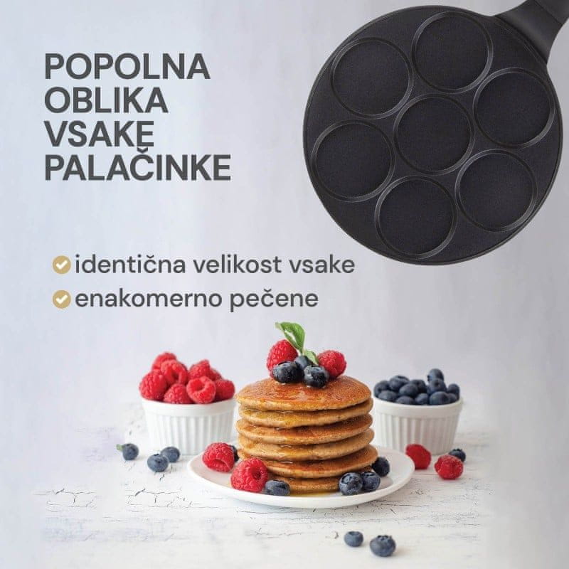 Ponev Rosmarino Infinity vam s svojimi 7 okroglimi odprtinami omogoča pripravo več palačink hkrati, kar prihrani čas in zagotavlja vedno popolno obliko. Poleg ameriških palačink lahko v kalupih spečete tudi jajca na oko, mini omlete ali polpete.