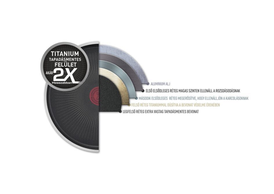 • Najboljša površina proti prijemanju z obdelavo proti praskam za največjo odpornost v ponvi, ki se ne boji nobenega orodja in v primerjavi s standardom Tefal Titanium zdrži do šestkrat dlje.