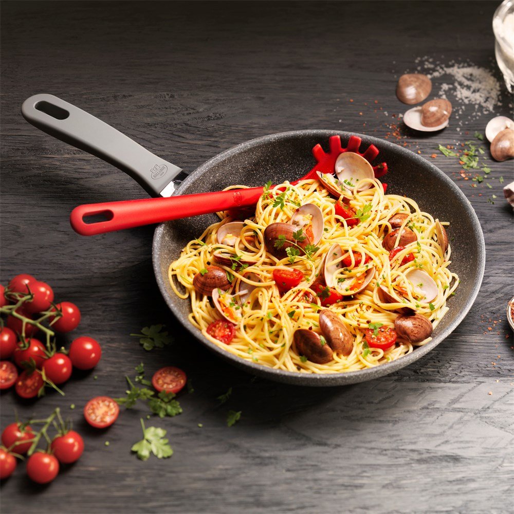 Ponev serije Murano znamke Ballarini bo postala vaš najbližji kuhinjski prijatelj. Cvrtje, dušenje in kuhanje bodo postali vsakodnevni užitek. Njen čudovit granitni dizajn je ustvaril ugledni oblikovalski dvojec Matteo Thun in Antonio Rodriguez. Ponev je odporna proti praskam in enostavna za čiščenje zaradi posebnega 5-slojnega, 4,5 mm debelega premaza GRANITUM Extreme proti prijemanju. Primerna je za pomivanje v pomivalnem stroju, vendar je za izjemno vzdržljivost priporočljivo ročno pomivanje. Visokokakovosten material, izdelan iz masivnega, kovanega aluminija, med segrevanjem prihrani dragoceni čas. Je primerna za indukcijo? Absolutno! Če imate indukcijsko kuhalno ploščo, boste prihranili še več energije, saj edinstveno, sijoče dno odlično porazdeli toploto. Praktična termo točka na ročaju priročno prikazuje idealno stopnjo toplote s spreminjanjem barve. Zajtrk samo za vas? Popolno! Ta lonec s premerom 20 cm je kot nalašč za pripravo posameznih jedi, ne glede na to, ali kuhate od začetka ali jih le pogrevate. Potrebujete nekaj večjega? Široka izbira 5 velikosti vam omogoča, da pripravite obroke za toliko ljudi, kot jih potrebujete. POSEBNE LASTNOSTI: Popolna za vsakodnevno uporabo. Trpežna in odporna proti koroziji zahvaljujoč posebnemu 5-slojnemu premazu GRANITUM Extreme proti prijemanju. Idealna tudi za indukcijske kuhalne plošče. Opremljena s priročnim termometrom Thermopoint. Eleganten granitni videz s sivim ročajem Soft-Touch. Zasnovano v Milanu, izdelano v Italiji. DIMENZIJE: Na voljo v velikosti 28 cm.