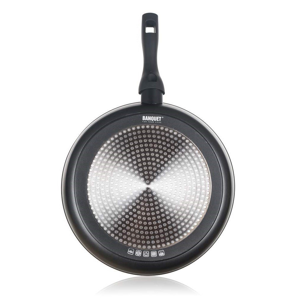 Aluminijasta kovana ponev GRAZIA 30 × 6,2 cm s 3-slojno površino brez prijemanja blagovne znamke ILAG PREMIUM, z zunanjo 2-slojno toplotno odporno prevleko, črne mat barve, ojačana z debelino. 4,0 mm stena, indukcijsko dno z laserskim tiskom piktogramov.