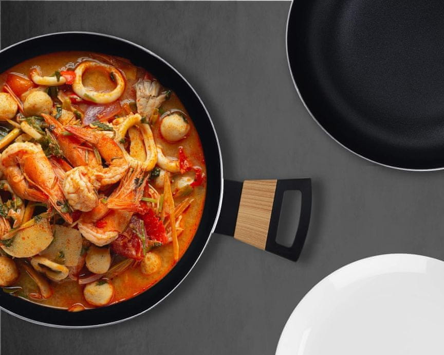 - Globoka ponev s premerom 28 cm. – Plošča iz stiskanega aluminija, ki se prilagaja uporabnikovi višini. – Trdna ponev z nelepljivo prevleko, ki zagotavlja optimalno delovanje. – Ergonomski toplotno odporen ročaj.