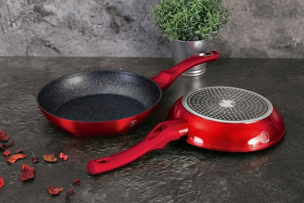• material: kovani aluminij s površino iz marmorja- barva: bordo rdeča, kovinska- komplet 3 kosov vsebuje:- ponev za cvrtje premera 24 × 5 cm- ponev za cvrtje premera 20 × 4,2 cm- ponev za žar 28 × 28 cm- 3-slojna površina brez prijema …