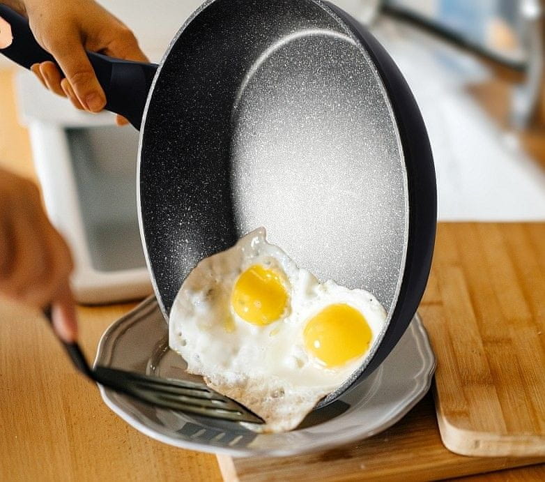 - kovano aluminijasto jedro ponve je zelo stabilno in ima odlično toplotno prevodnost, zato se ne le hitro in enakomerno segreje po celotni površini, pa med kuhanjem tudi zelo enostavno ohranja temperaturo