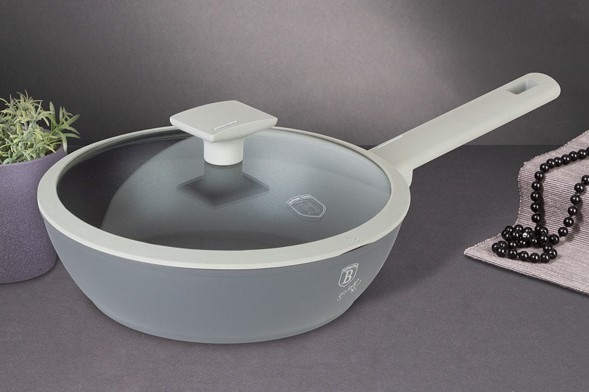 Kuhinjska posoda iz serije ASPEN podjetja BERLINGER HAUS je izdelana iz visokokakovostnega litega aluminija z izjemno trdo titanovo prevleko v notranjosti. Zunanja prevleka je sive barve. Ta privlačna in modna posoda je standardno opremljena z ročaji SOFT TOUCH (silikonski ročaji). Primeren za vse vrste štedilnikov: plinski, električni, keramični, halogenski, indukcijski. Sistem TURBO INDUCTION (zelo hitro se segrejejo) omogoča do 35-odstotni prihranek energije.