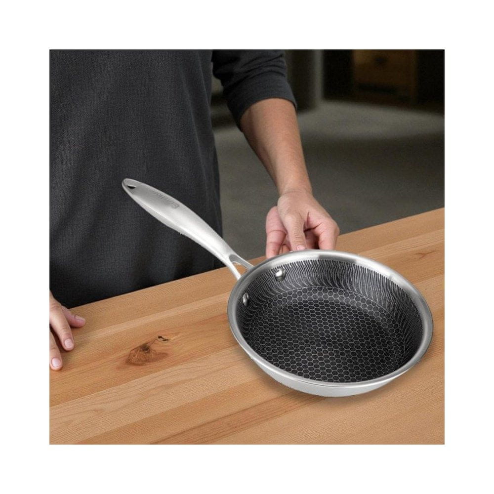 Zahvaljujoč tej rešitvi je ponev bolj trpežna, odporna na praske in varna za uporabo s kovinskimi kuhinjskimi pripomočki. Premaz omogoča bolj zdravo cvrtje z minimalno maščobo in hkrati preprečuje prijemanje hrane.