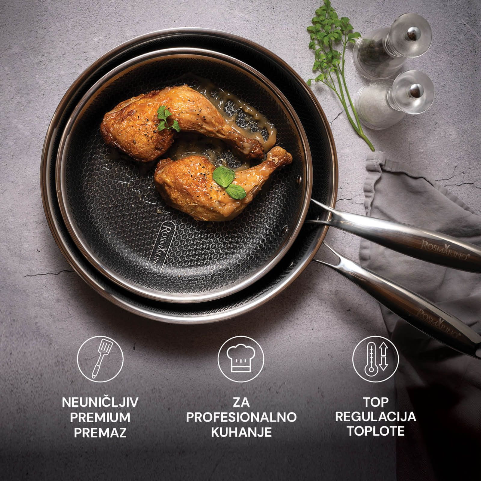 Linija Rosmarino HexaPRO je zasnovana za vse, ki si želijo kuhati kot pravi profesionalci – kar doma. Združuje najboljše lastnosti nerjavečega jekla, aluminija in neoprijemljivega premaza v edinstveni hibridni sestavi, ki omogoča hitro in enakomerno porazdelitev toplote, neuničljivo površino, odporno proti praskam, ter brezhibno kuhanje brez prijemanja hrane. Vrhunski neoprijemljivi premaz s heksagonalno strukturo omogoča kuhanje z minimalno uporabo maščobe, ročaji se pri kuhanju ne segrevajo, posoda pa je primerna tudi za uporabo v pečici do 220 °C. HexaPRO je popolna izbira za vse kuharske entuziaste, ki iščejo vsestranskost, trajnost in vrhunsko kulinarično izkušnjo.