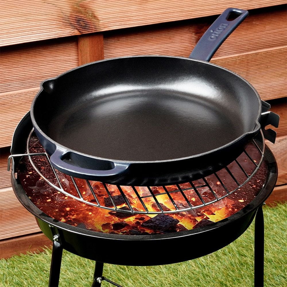 Ta okrogla litoželezna ponev je idealna za pripravo različnih jedi. Opremljena z dolgim in kratkim ročajem zagotavlja hitro in enakomerno kuhanje. Uporabljate jo lahko na kateri koli kuhalni plošči, pa tudi neposredno na žaru ali ognju. Ponev je izjemno trdna in težka. Litoželezo se enakomerno segreva in dolgo časa ohranja toploto, zato bo vaša hrana dlje časa ostala topla. Originalni izdelek češke blagovne znamke Orion. Izdelano v skladu z evropskimi standardi