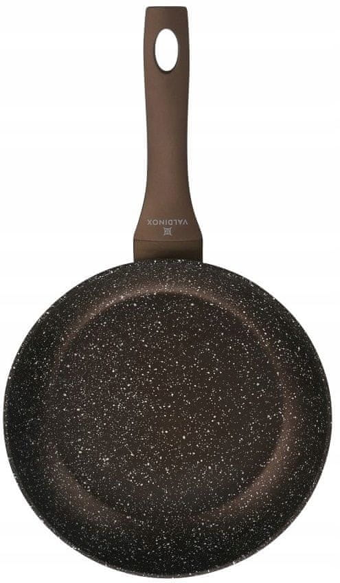 Aurum globoka ponev 20 cm. Ponve VALDINOX so izdelane s tehnologijo kovanega kova, zaradi česar so izjemno trpežne. Velik, udoben ročaj omogoča varno kuhanje. Notranjost ponve je prevlečena s premazom proti prijemanju, ki preprečuje prijemanje hrane. Poleg tega jo lahko cvrete z majhno količino maščobe, zaradi česar ima manj kalorij, je bolj zdrava ter ohranja njen okus in aromo. Poleg tega se ponev segreje hitreje in enakomerneje, kar ohranja temperaturo hrane dlje časa. Opremljena je z udobnim in priročnim ročajem z leseno teksturo, ki je posebej oblikovan in zmanjšuje toploto ter ščiti roke pred opeklinami. Specifikacije: Znamka: Valdinox Premer ponve: 20 cm Višina ponve: Premaz proti prijemanju Primerno za vse vrste štedilnikov