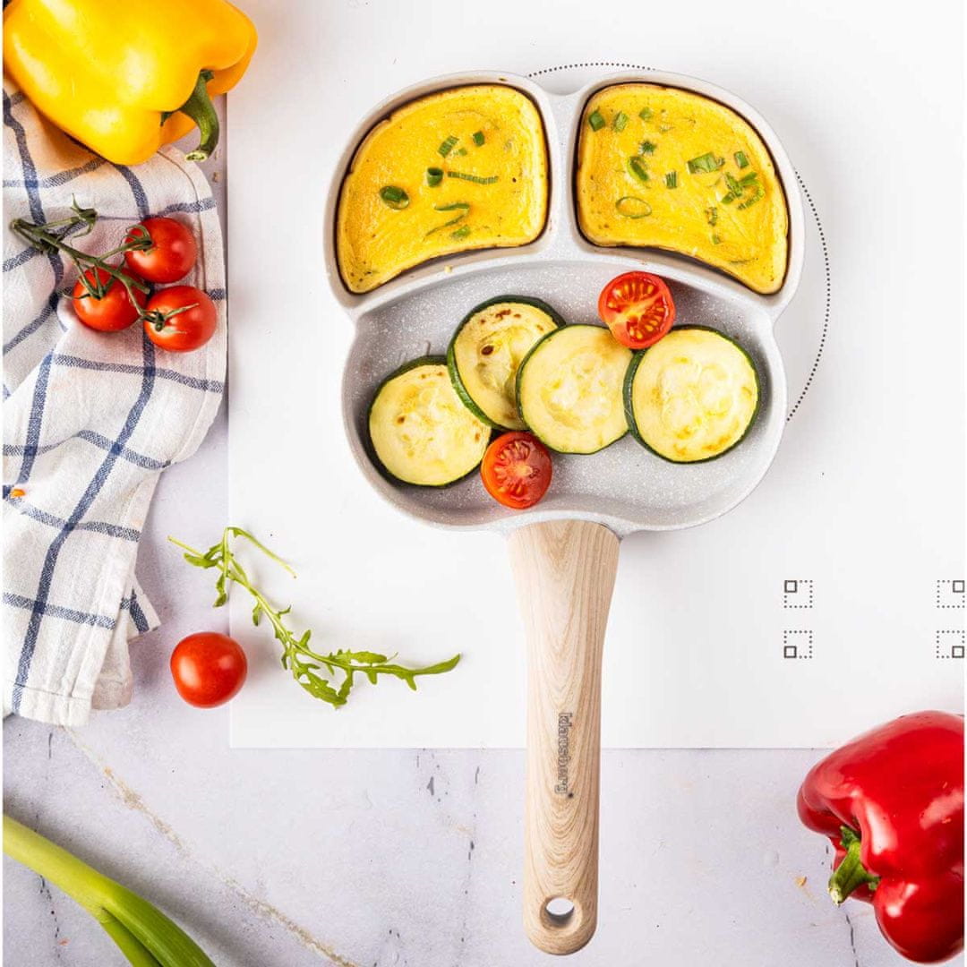 Tridelna zasnova ponve omogoča hkratno cvrtje različnih sestavin, kot so jajca, palačinke, slanina, zelenjava ali klobase, brez mešanja okusov in arom. Vsak predel je ustrezno velik za različne vrste hrane – manjši predelki so idealni za jajca, večji pa za praženje zelenjave ali mesa.