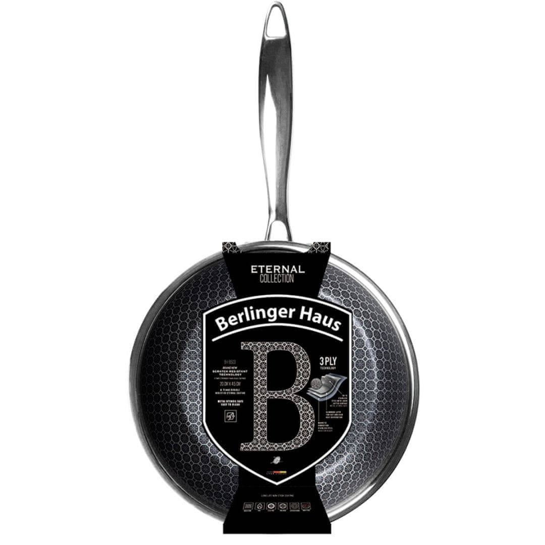Eternal Collection je linija posode Berlinger Haus z inovativnim 3D premazom. Ohišje posode je izdelano iz nerjavečega jekla 18/10. Ima troslojno, akutermično dno, ki odlično akumulira toploto in jo enakomerno porazdeli po celotni površini ponve. 3D premaz je nanesen v obliki sataste mreže. Ta premaz je izjemno trpežen in odporen proti praskam. Omogoča cvrtje in kuhanje z minimalno količino maščobe. Hrana se ne prime niti pri cvrtju pri visokih temperaturah. Serija je primerna za vse vrste kuhalnih plošč – vključno s plinskimi, električnimi, keramičnimi in indukcijskimi. Premaz je petkrat trši od teflonskih in granitnih premazov. To pomeni, da bo posoda zdržala leta, ne da bi izgubila svoje lastnosti. Nedvomna prednost je enostavno čiščenje. Posoda je primerna za pomivanje v pomivalnem stroju.