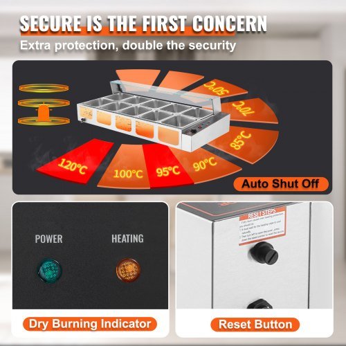 Ta komercialni grelnik hrane je zasnovan za učinkovito in zanesljivo postrežbo hrane v gostinskih restavracijah in bifejih. Z robustno konstrukcijo iz nerjavečega jekla in steklenim pokrovom zagotavlja da vaše jedi ostanejo tople in sveže dalj časa. Nastavljiva kontrola temperature in varnostne funkcije nudijo udobje in brezskrbnost med napornimi urami postrežbe.
