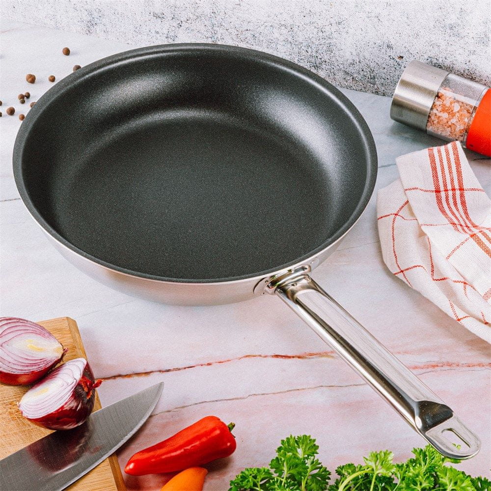 Premaz proti prijemanju je sestavljen iz treh plasti in je še posebej trpežen ter dolgotrajen. Zahvaljujoč močnemu aluminijastemu jedru dna, prevlečenega s premazom SIGMA, se ponev iz nerjavečega jekla hitro segreje. Toplota se zelo enakomerno porazdeli po robu. Ali imate pri kuhanju raje indukcijsko kuhalno ploščo? Ni problema. Posoda je primerna za vse vrste štedilnikov in jo lahko pomivate v pomivalnem stroju. To pomeni manj dela in se lahko popolnoma osredotočite na svoje goste.