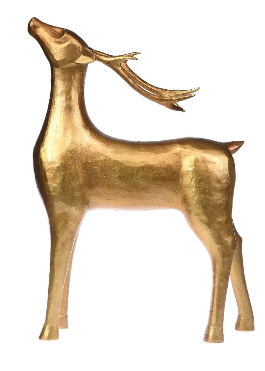 Zlati stoječi jelen z višino 43 cm. Kovinski jelen, premazan z nežno zlato barvo, je izredno minimalističen, njegov čar pa povečujejo nagnjena glava in ozko, visoko rogovje. Podstavek figurice sestavljajo štiri robustne noge jelena. Čudovita figurica je lahko vzdušni dodatek k vašemu božičnemu aranž Celoten opis
