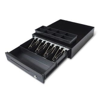 Predal za denar se odpira na dva načina in sicer ročno s ključem ali električno ter vsebuje štiri ležišča za bankovce in osem čašic za kovance. Blagajna ima kovinsko ohišje, vstavek za denar pa je plastičen in ima integrirana plastična vodila. Mere predala 350 × 405 × 90 mm, masa 5,4 kg, mere kartona 45,3 × 40,2 × 13,5 cm.