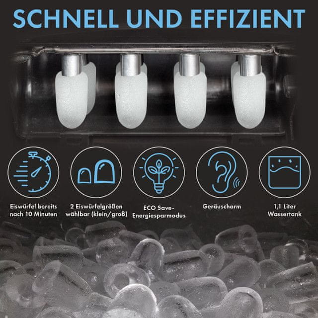 Kompaktni aparat za izdelavo ledenih kock brez potrebe po vodnem priključku. Brez zapletene namestitve ter za hitro in enostavno izdelavo ledu s pritiskom na gumb. Idealen za kampiranje, pisarno, kuhinjo ali domači bar. Ne potrebujete dodatnega priključka za vodo in je pripravljen za uporabo. Vgrajen 1,1-litrski rezervoar za vodo. Led je pripravljen v samo 10 minutah. Izdelovalnik ledu lahko v 24 urah pripravi do 8–10 kg ledu. Je zelo enostaven za uporabo, saj se vklopi z enim samim gumbom. Izbirate lahko med proizvodnjo majhnih in velikih kock. Lučke LED označujejo, če v aparatu ni vode ali če je posoda za led polna. Varen način ECO – naprava se izklopi, ko je posoda za led polna. Stroj ima program za čiščenje za higiensko izpiranje z vodo. Stroj ima 4 kontrolne lučke. Delovanje lahko spremljate z velikim oknom na stroju. Zelo tiho delovanje. Priložena je zajemalka za led.