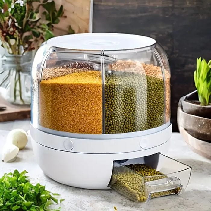 Iščete praktično rešitev za shranjevanje hrane v razsutem stanju? Ta Vrtljiva posoda za hrano s 6 prekatnimi predelki je popolna rešitev, ki vam bo pomagala ohranjati vašo kuhinjo organizirano in hrano svežo. Omogoča vam, da na enem mestu organizirate različna živila, kot so kosmiči, oreščki, testenine, žitarice, sladkarije in kavna zrna!