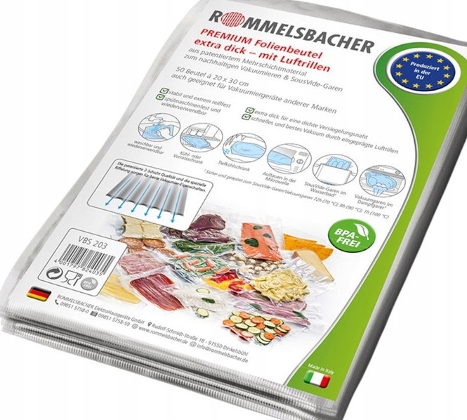 Vrečke za vakuumsko pakiranje Rommelsbacher VBS 203 so komplet 50 visokokakovostnih vrečk velikosti 20 × 30 cm, namenjenih dolgotrajnemu shranjevanju živil v vakuumu. Izdelane so iz trpežnega, večplastnega materiala brez BPA in so primerne za zamrzovanje, kuhanje, kuhanje sous vide ter shranjevanje suhih in vlažnih živil. Vrečke so združljive z vsemi vakuumskimi aparati Rommelsbacher in večino modelov drugih znamk. So idealna rešitev za dolgotrajno ohranjanje svežine, arome in kakovosti živil.