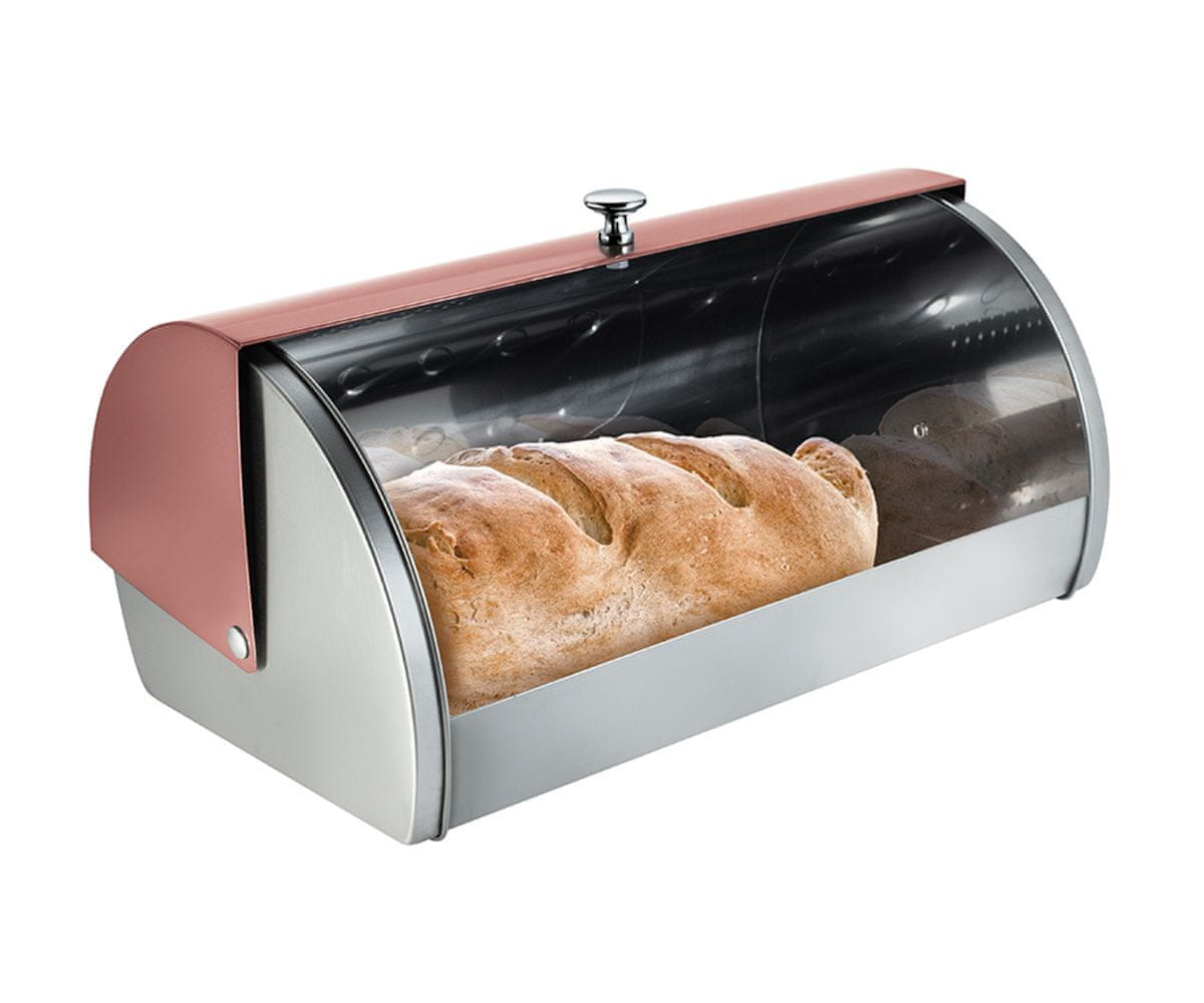 Skrinja za kruh iz ogljikovega jekla v srebrni barvi. Pokrov v barvi rožnatega zlata.