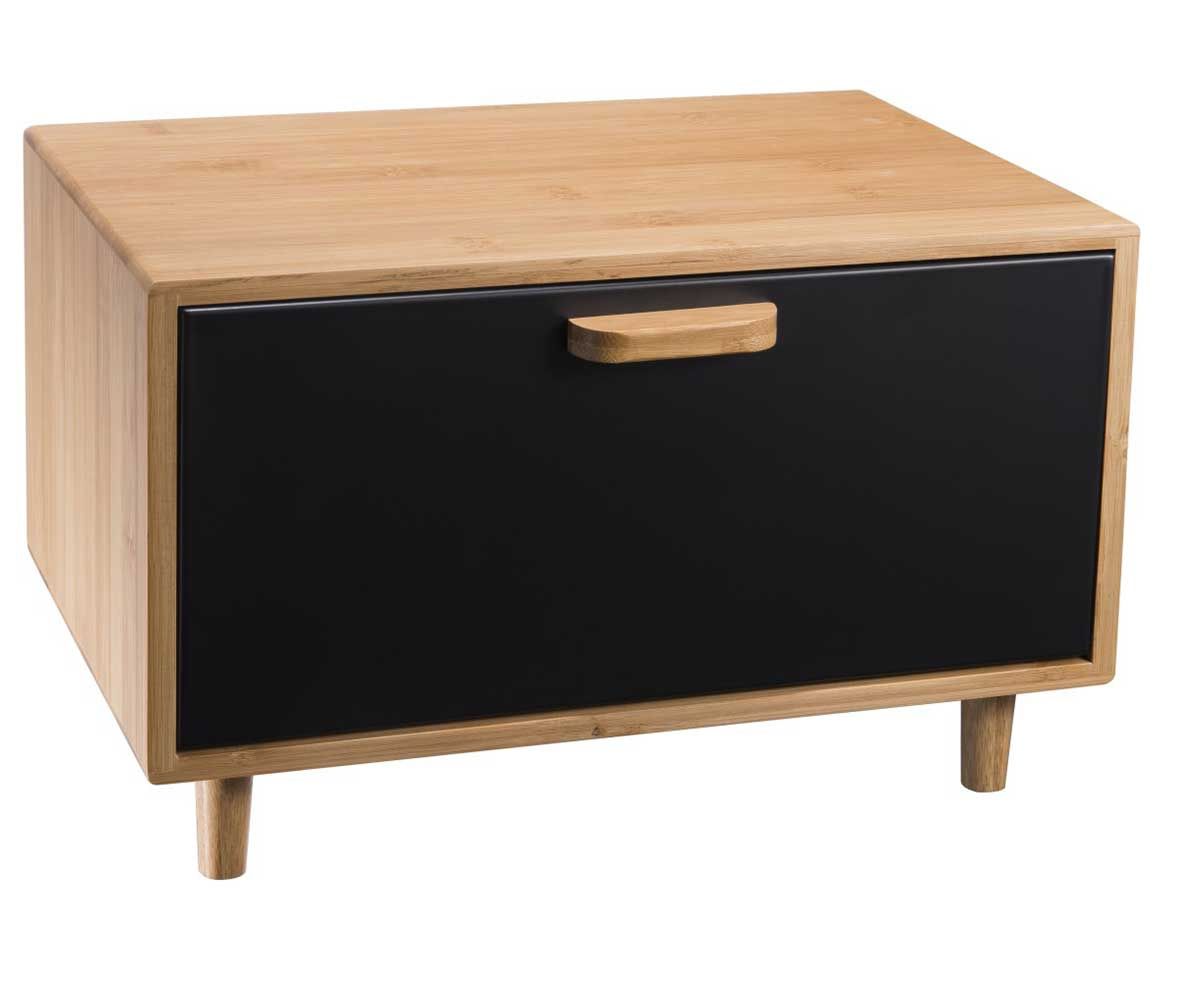 - Telo iz bambusovega lesa, vrata, ki se odpirajo navzdol, iz prašno lakiranega jekla.
