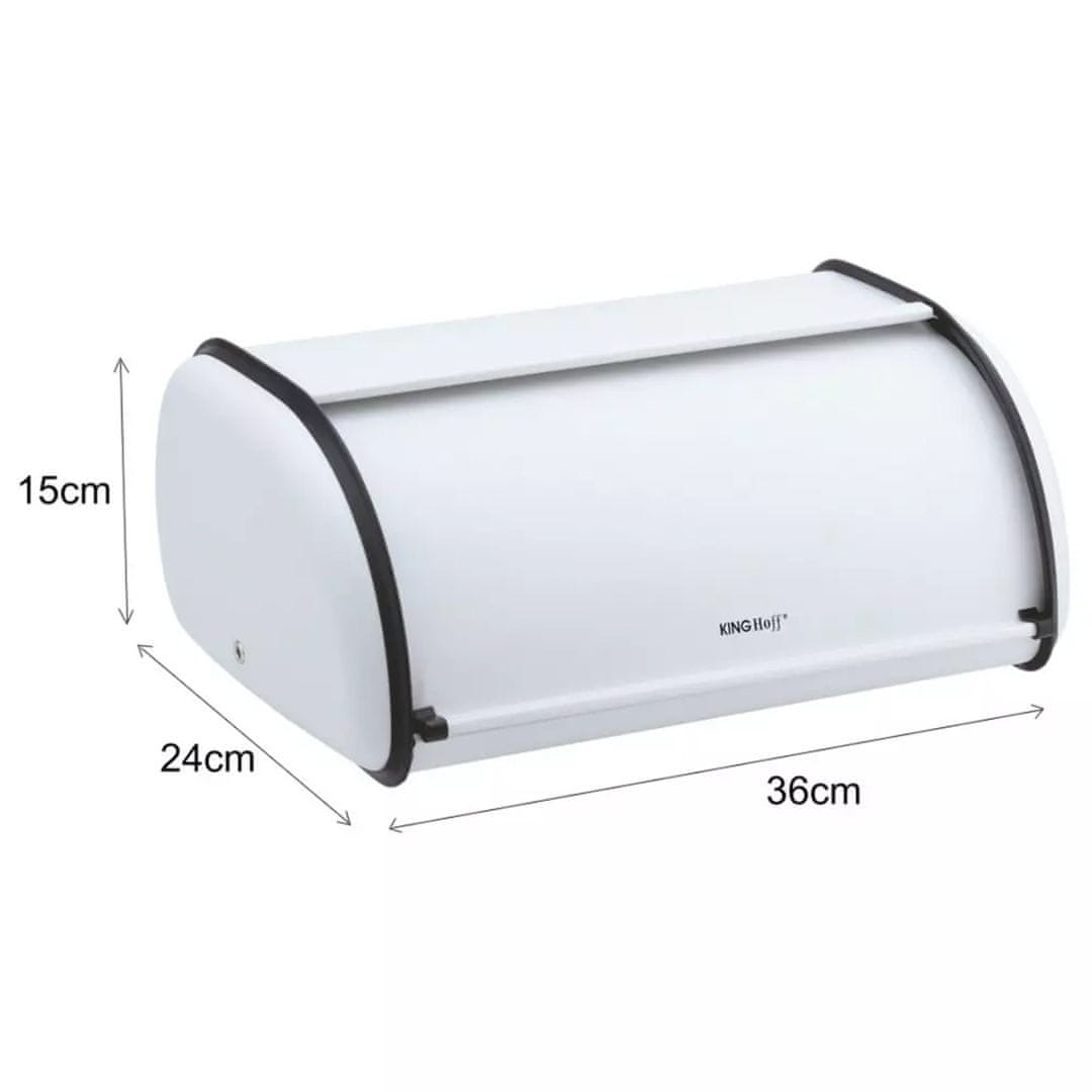 Velika posoda za kruh iz lakiranega nerjavečega jekla v beli barvi. Lastnosti: Primerna za shranjevanje vseh vrst kruha, Enostavno čiščenje, Trajna in odporna proti poškodbam, Pokrov se nežno odpira in priročno zapira za lažji dostop Dimenzije: Višina: 15 cm, Širina: 24 cm, Dolžina: 36 cm
