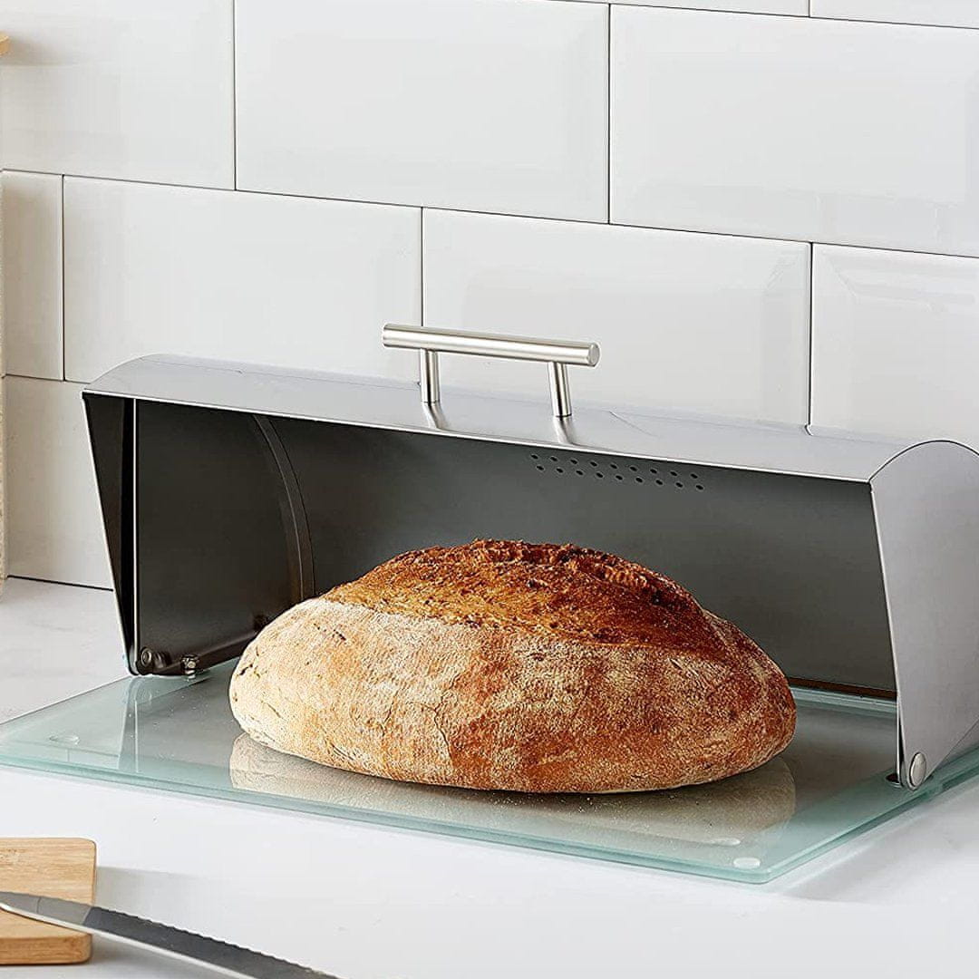 Videz moderno elegantne posode za kruh iz matiranega nerjavečega jekla 18/0 vas bo zagotovo navdušil. Podstavek posode, ki služi tudi kot deska za rezanje, je izdelan iz kaljenega stekla, podloženega s štirimi silikonskimi nogicami za varen oprijem. Kruh in ostali pekovski izdelki bodo ostali še dolgo časa sveži in okusni.