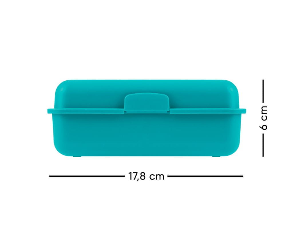 • Plastična škatla za prigrizke v turkizni barvi. – Škatlica se zapira z enojno ključavnico in ima razdelilnik.- Ni priporočljivo uporabljati v pomivalnem stroju.