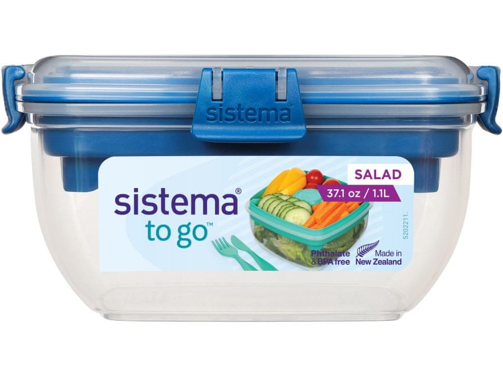 Sistema Salad TO GO je idealna škatla za solato za tiste, ki želijo uživajo v sveži in okusni solati na poti. Z ločenimi predali in posodo za preliv lahko sestavine do trenutka uživanja hranite ločeno. Priročna stran Vilice in nož zdrsneta v pokrov, zato vam ni treba nositi dodatnih