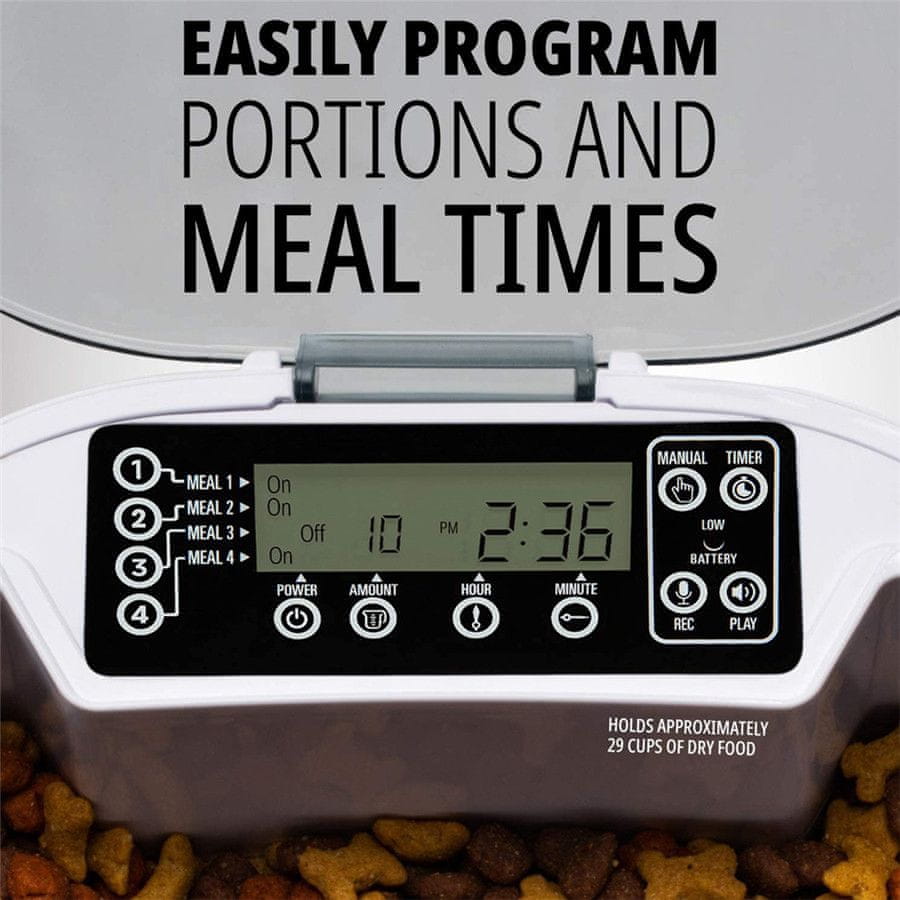 Se zadržujete v službi in ne morete priti domov, da bi nahranili svojega hišnega ljubljenčka? Ste pozabili pripraviti hrano, medtem ko ste na službenem potovanju? Vse te situacije lahko preprečite, če si omislite pametni dozirnik hrane za pse in mačke. Z gumbi in zaslonom lahko preprosto nastavite načrtovano hranjenje, tj. glasnost, čas in datum, vključno s ponovitvami. Intervale in količino hrane nastavite idealno, da se vaš pes ali mačka ne bo prenajedala: to bo dolgoročno koristilo njenemu stanju. V primeru vaše odsotnosti lahko posnamete tudi kratko 10-sekundno sporočilo, s katerim na daljavo opozorite svojega ljubljenčka na čas hranjenja. Hranilnik ima enostavno odstranljivo posodo in pladenj za hrano, kar vam omogoča enostavno čiščenje. Poleg tega lahko z dvema rotorjema prilagodite velikost vsakega obroka potrebam in velikosti vašega hišnega ljubljenčka !