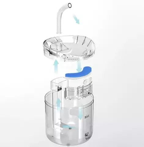 • FILTRIRNI SISTEM – vodna fontana za hišne ljubljenčke opremljena s 3-slojnim vodnim filtrom, ki odstranjuje delce hrane, dlak in drugih nečistoč. Fontana bo vašim ljubljenčkom zagotavljala svežo in čisto vodo ves dan!
