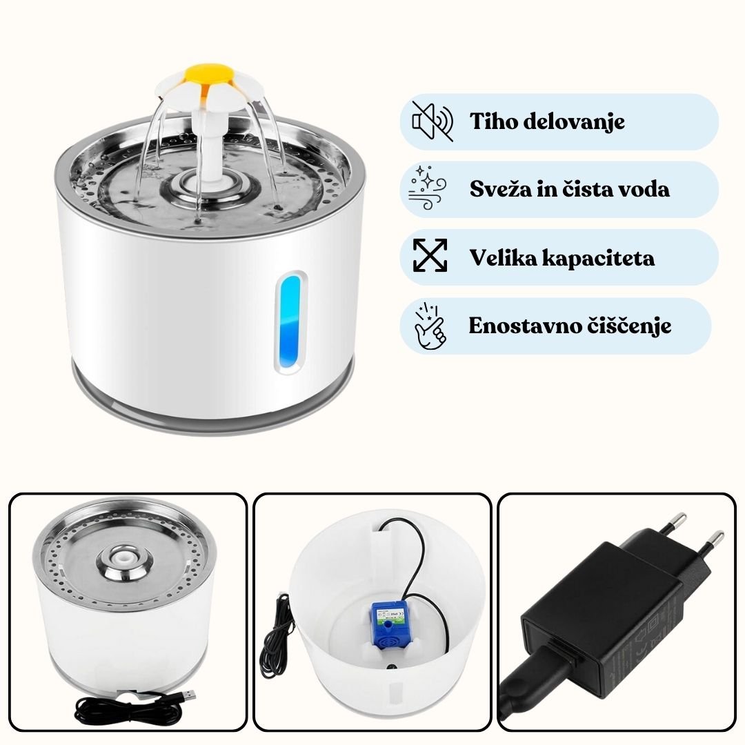 Mačke si zaslužijo svežo vodoIzredno tiha fontana z zanimivo oblikovano šobo in s kapaciteto 2,4 l. To točno to, kar mačke potrebujejo, da ostanejo zdrave in zadovoljne. Mačke si zaslužijo samo najboljše, voda ni izjema.