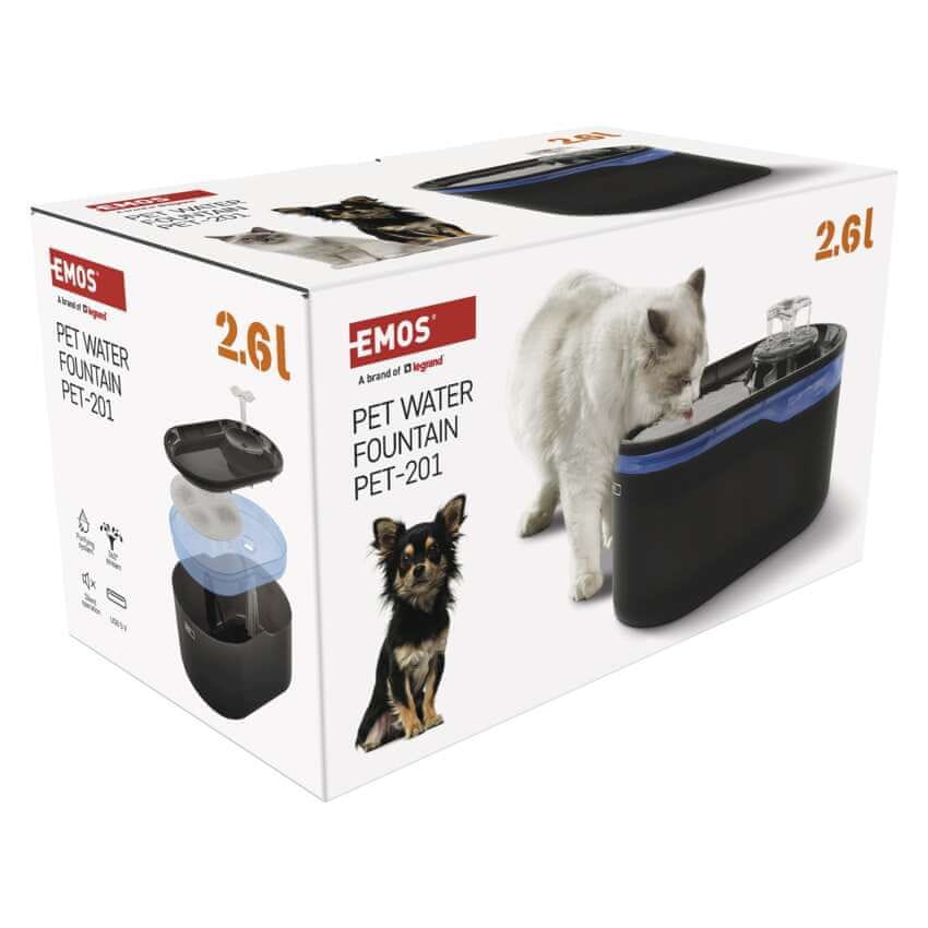Emos Pet Care napajalnik za hišne ljubljenčke s prostornino 2,6 litrov. Napajalnik filtrira vodo ter poskrbi, da je ta vedno čista za vašega štirinožnega prijatelja. Primeren je za majhne in srednje pasme.