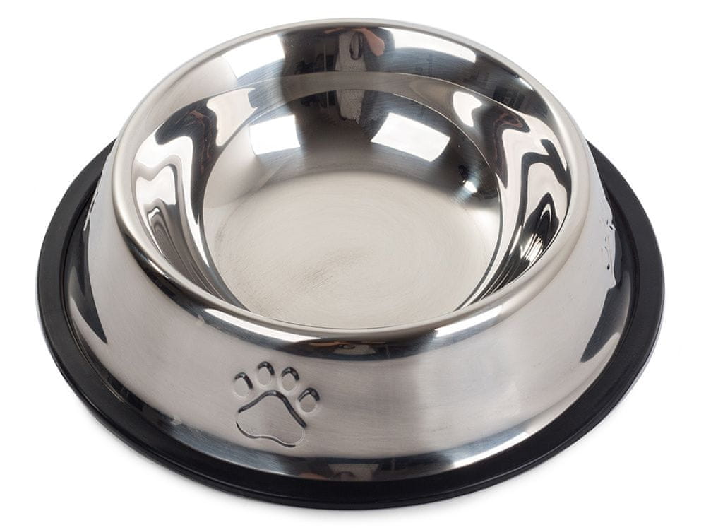Izdelana je iz nerjavečega jekla in ima nedrsečo gumo, ki preprečuje premikanje posode za hrano.