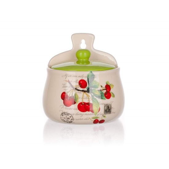 Viseča škatla s pokrovom CHERRY, material – keramika, kremasta glazura z dekoracijo češnje, zelen pokrov. Celoten opis