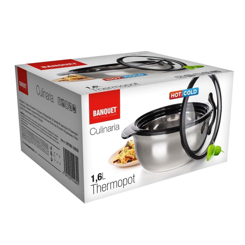 Termo posoda CULINARIA s pokrovom in prostornino 1,6 l je praktična za shranjevanje vroče hrane. Še posebej ga cenijo kuharji in kuharice, ko shranjujejo pripravljene jedi pred serviranjem. Iz nerjavečega jekla s steklenim pokrovom. Termo lonec je na voljo v dveh velikostih. Notranjost lonca sestavlja vložek iz nerjavnega jekla, polnilo med stenami pa je izdelano iz PUR pene, ki zagotavlja odlično izolacijo pri shranjevanju ali prenašanju hrane.
