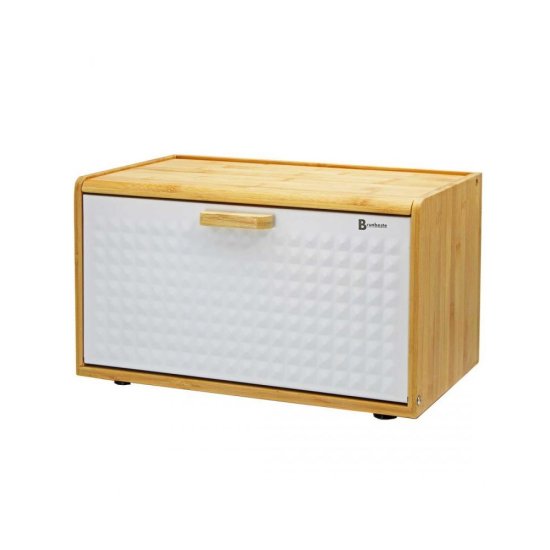 Bambusova posoda za kruh z elegantnim in modernim dizajnom, opremljena z dvema pokrovoma. Sprednji pokrov je izdelan iz belega jekla, kar daje posodi za kruh eleganten videz, zgornji pokrov pa je izdelan iz naravnega bambusovega lesa. Praktična zasnova omogoča enostaven dostop do kruha, robustni materiali pa zagotavljajo vzdržljivost in higiensko shranjevanje. Popolno za vsako kuhinjo, saj združuje funkcionalnost in estetiko.