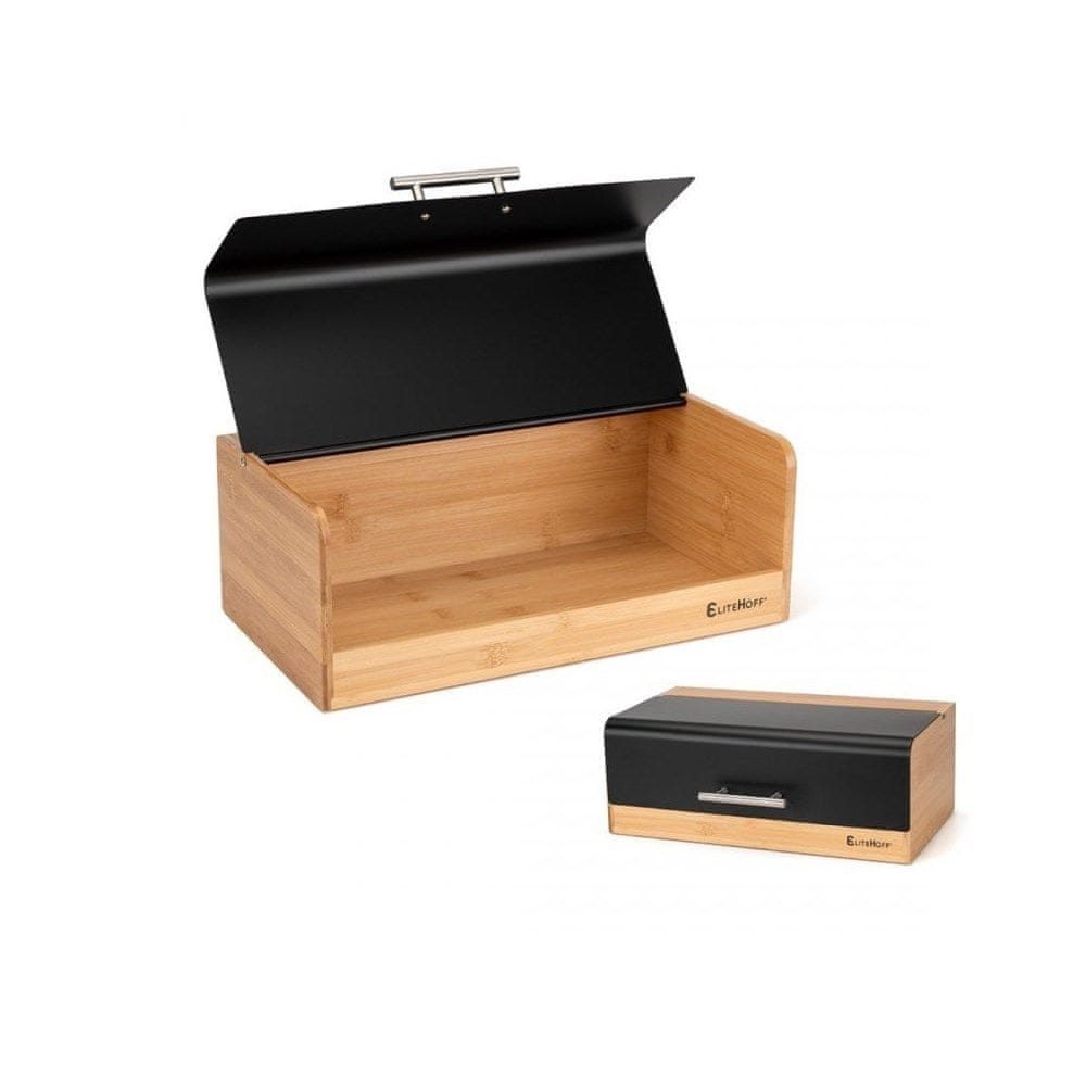 Sodobna oblika posode za kruh, njena privlačna oblika in kombinacija črne kovine in bambusa odlično izgledajo na pultu.