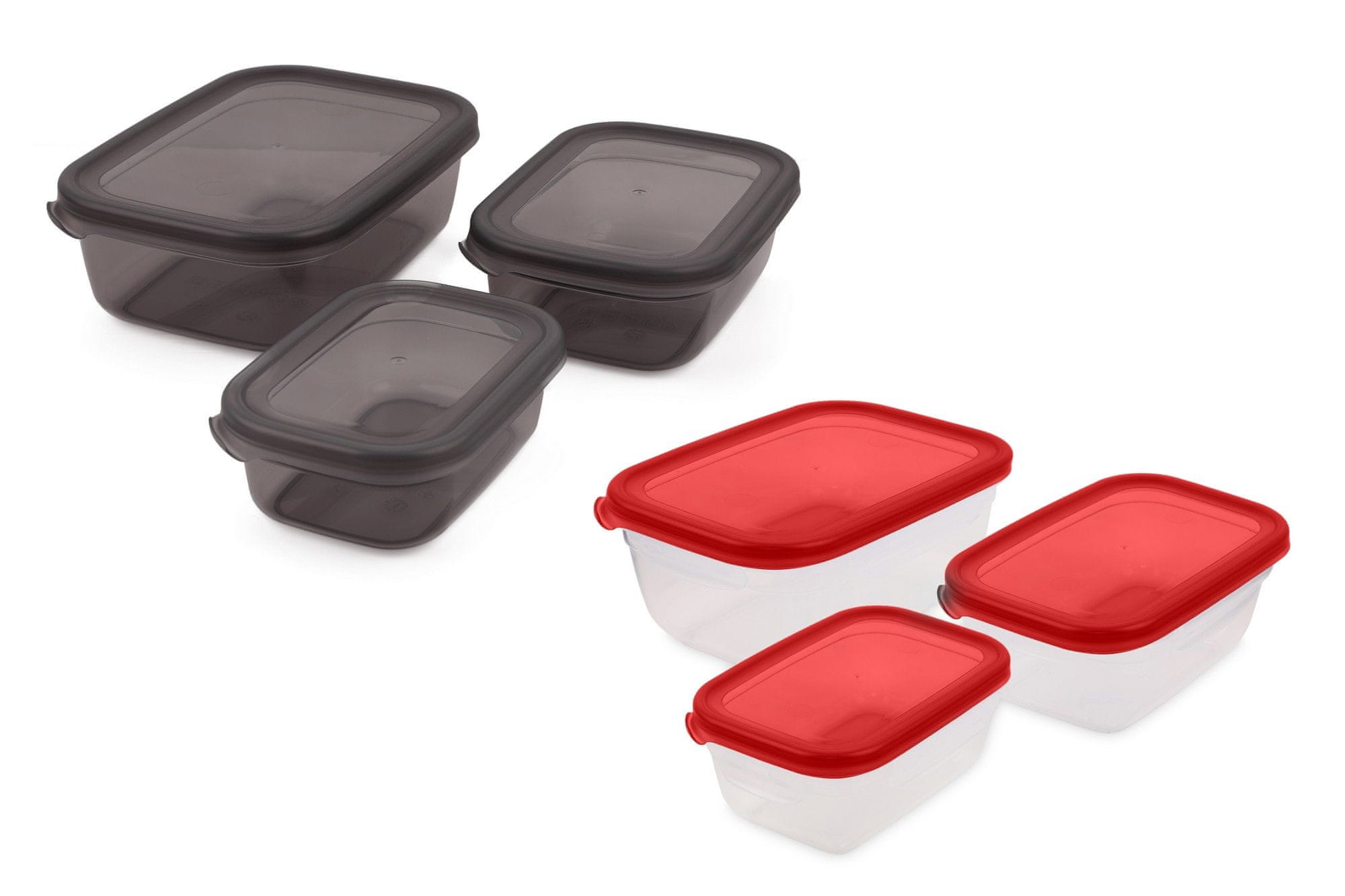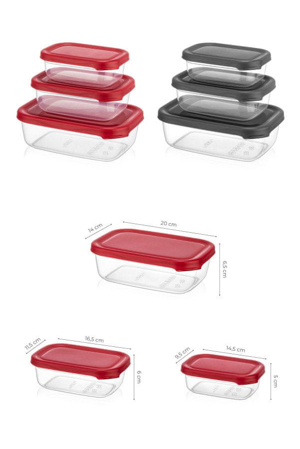 100 % PLASTIKA Velikost: 14 × 20 × 6,5 cm / 1200 ml (2 kosa) Velikost: 12 × 16,5 × 5,5 cm / 670 ml (2 kosa) Velikost: 10 × 14 × 4,5 cm / 400 ml (2 kosa)