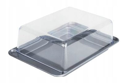 Ta posoda za maslo je zelo elegantna in praktična posoda. Posoda je izdelana iz plastike. Podstavek je srebrne barve, pokrov pa prozoren.