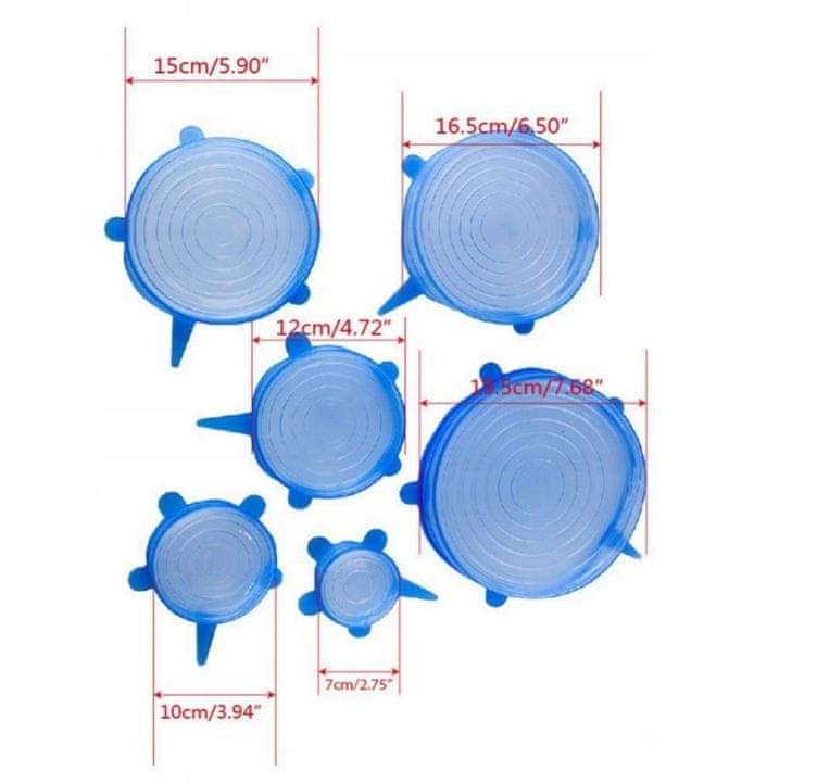 SILIKONSKI POKROVI ZA ŽIVILA UNIVERZALNI 6 KOSOV DA IZDELKE OHRANIJO SVEŽI Silikonski pokrovi za živila bodo nadomestili navadno aluminijasto folijo in preprečili izsušitev in kvarjenje hrane. Silikonski pokrovi pripomorejo k ohranjanju svežine in dodatno blokirajo vonjave, ki ne bodo uhajale iz hrane ali se jih le-ta navzela, saj izdelke tesno ščitijo. Prednosti: prilagodljiv material – pokrovi so izdelani iz trpežnega silikona brez vonja, ki se odlično prilega različnim vrstam posod, skled in krožnikov, zaradi česar so pokrovi univerzalni. temperaturno odporen material – z njimi lahko prekrijete vrelo vodo, uporabljate pa jih tudi v zamrzovalniku in mikrovalovni pečici omogočajo shranjevanje suhih in tekočih snovi, zahvaljujoč tem pokrovom boste hrano ohranili svežo dlje časa ne prenašajo vonjav v hladilniku so za večkratno uporabo – uporabite jih lahko večkrat, samo pomijte jih pod tekočo vodo ali v pomivalnem stroju in že je pripravljen Komplet pokrovov iz silikona, se prilagodi različnim vrstam posode, prenese vse vrsta materiala (steklo, porcelan, jeklo, plastika itd.). Vsak pokrov je opremljen s 4 posebnimi ušesi in repom na robu. S potegom za ušesa lahko previdno namestimo pokrov na posodo. Rep bo olajšal odstranitev pokrova. Silikoni so temperaturno obstojni, lahko pokrijete vrelo vodo in jih uporabljate v zamrzovalniku, z njimi lahko brez problema pogrejete hrano tudi v mikrovalovni pečici. Pokrovi omogočajo tudi shranjevanje tekočine. Hrana bo dlje ostala sveža in vonj se ne bo širil v hladilniku. Sadje in zelenjava bosta ves čas ostala sočna in sveža, pokrovčki jima ne bodo dovolili, da bi se izsušila. Uporaba kompleta pokrovov bo prinesla velik prihranek v vašem proračunu, ni vam treba nenehno kupovati folije, pokrov le operite pod tekočo vodo (ali v pomivalnem stroju) in že bo pripravljen za nadaljnjo uporabo.