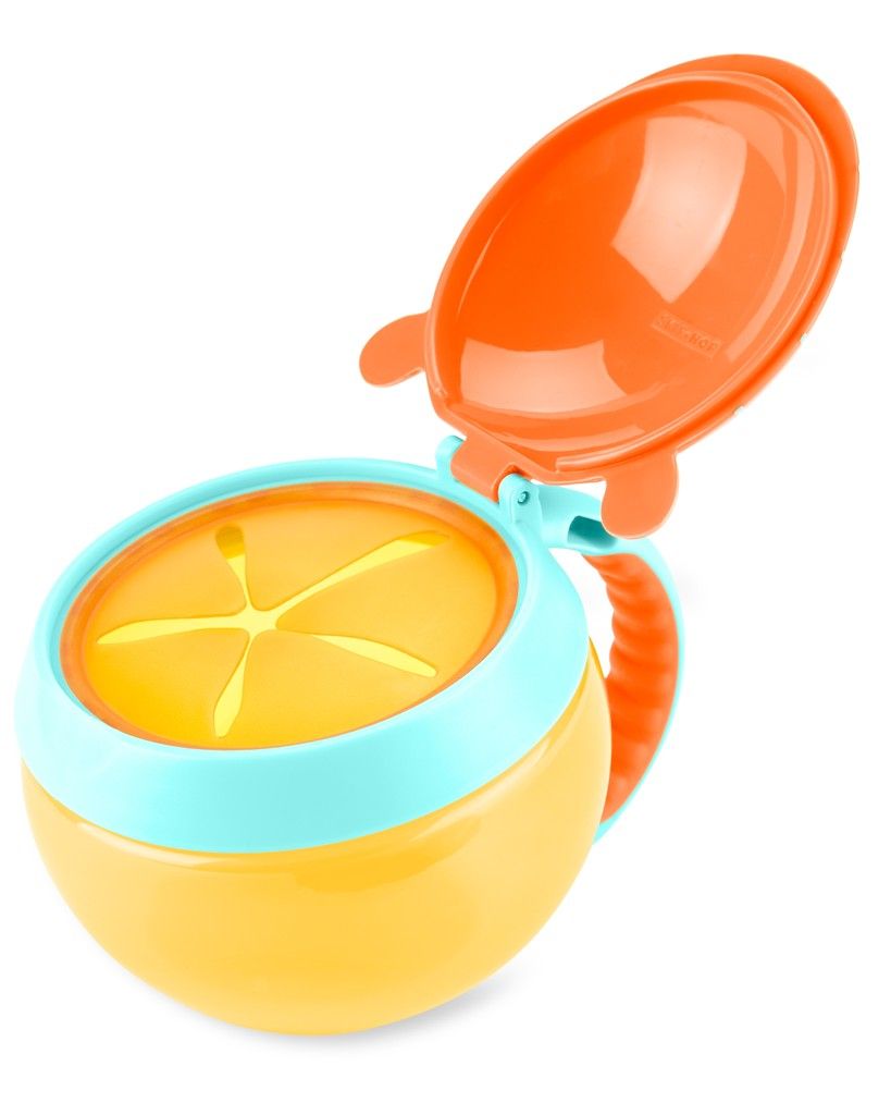 Pokrov ima pokrov, ki se ob odprtju drži, pred razlitjem vsebine pa je zaščiten z elastičnimi letvicami, ki omogočajo vstop otrokove majhne roke, vendar prigrizka ne izpustijo. Posoda je prozorna, zato jo je mogoče kmalu ponovno napolniti. Na strani je priročna zanka otroške velikosti, s katero lahko posodo pritrdite tudi na voziček ali torbo.